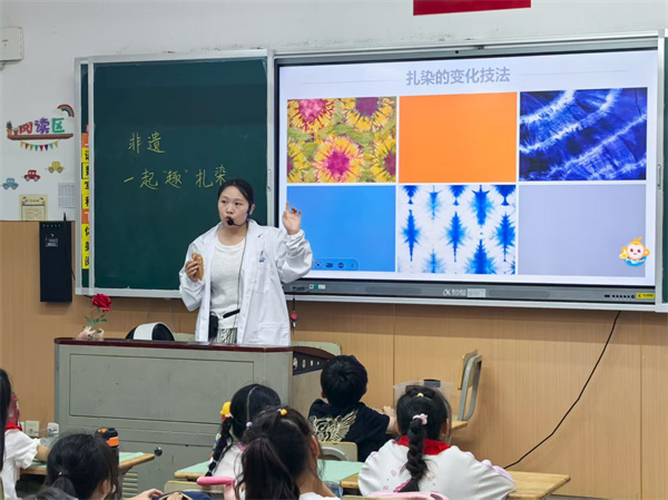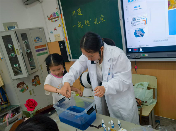 活動現(xiàn)場,科普老師通過趣味講解、實物展示和互動問答,帶領青少年穿越千年時光,探尋扎染技藝的前世今生。從商周時期的染色起源,到唐宋時期的技法革新,再到明清時期的民俗應用,孩子們在生動的圖文資料中觸摸歷史脈絡?!霸瓉砉糯擞冒逅{根就能染出這么漂亮的布料!”張雨荷同學在觀看染色原料展示時驚嘆道。