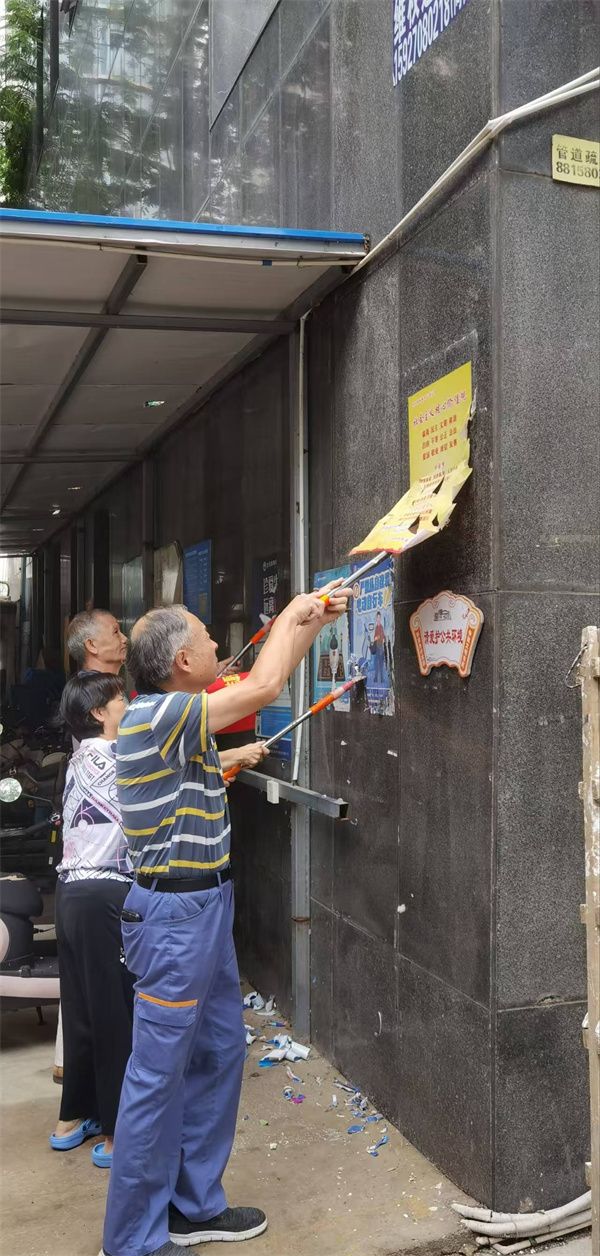 行動中,志愿者們分為兩組,分工協(xié)作、高效推進。“牛皮癬”清理組攜帶專業(yè)工具,對小區(qū)各樓棟墻面、單元門、電梯間及公共設施上的各類小廣告進行徹底清理。面對黏附牢固的廣告貼紙,大家先以噴壺濕潤軟化,再細致鏟除,最后用抹布擦拭干凈,不遺漏任何一處衛(wèi)生死角。