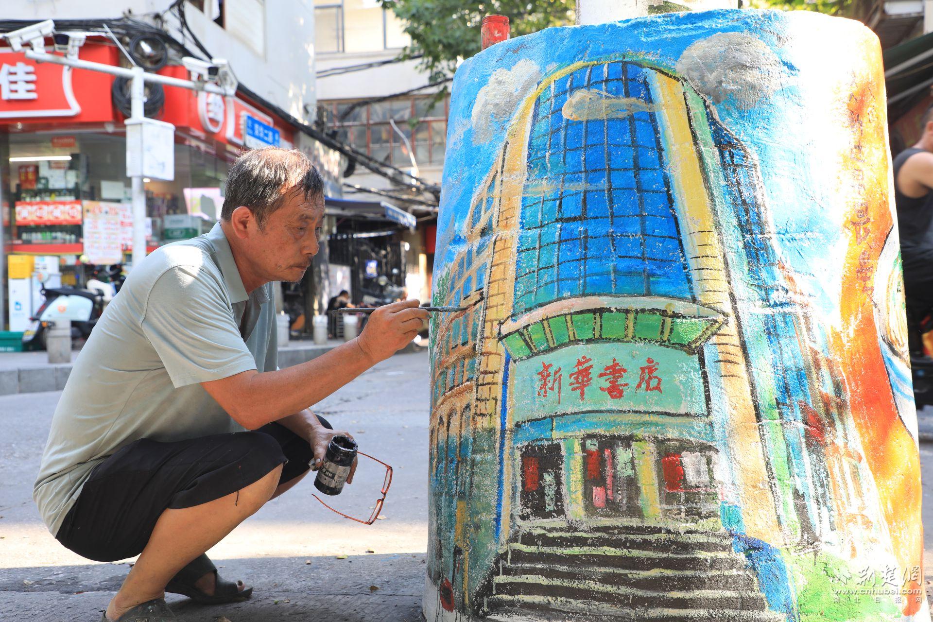 畢業(yè)于湖北美院雕塑專業(yè)的易小陽,年輕時(shí)就愛畫速寫。退休后,他決定把老街巷當(dāng)畫布。半年時(shí)間,他義務(wù)繪制了120多處墻繪,總面積近500平方米。