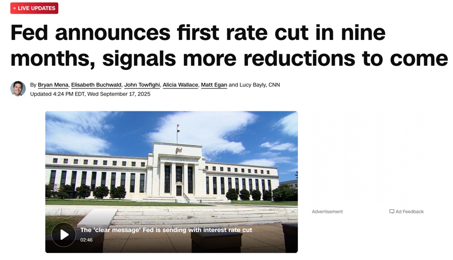 CNN報道,美聯(lián)儲9個月來首次宣布降息