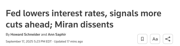 時間仿佛有意安排,去年9月18日,美聯(lián)儲以一次性50個基點的幅度開啟了最受矚目的降息周期;而一年后的9月17日,美聯(lián)儲再次選擇九月“動手”,但這一次,只是象征性下調(diào)25個基點。前后僅隔一年,同樣降息,力度與氛圍卻大相徑庭,這種反差可說是觀察美聯(lián)儲政策與美國經(jīng)濟政治環(huán)境變化的絕佳窗口。