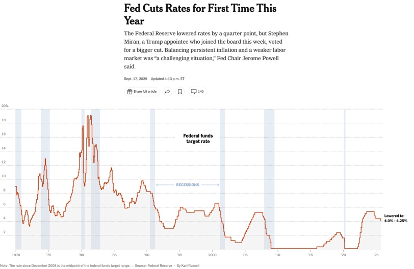 當(dāng)?shù)貢r間9月17日,如輿論預(yù)測,美聯(lián)儲宣布下調(diào)聯(lián)邦基準(zhǔn)利率25個基點至4.00%~4.25%的區(qū)間。這不僅是2024年底以來的首次降息,也是在就業(yè)市場走弱、政治壓力高企、全球市場高度關(guān)注下的一次“聚光燈會議”。從聲明到點陣圖,再到主席鮑威爾的記者會,釋放出的信號既有政策方向,也試圖表達(dá)美聯(lián)儲捍衛(wèi)其獨立性的立場。