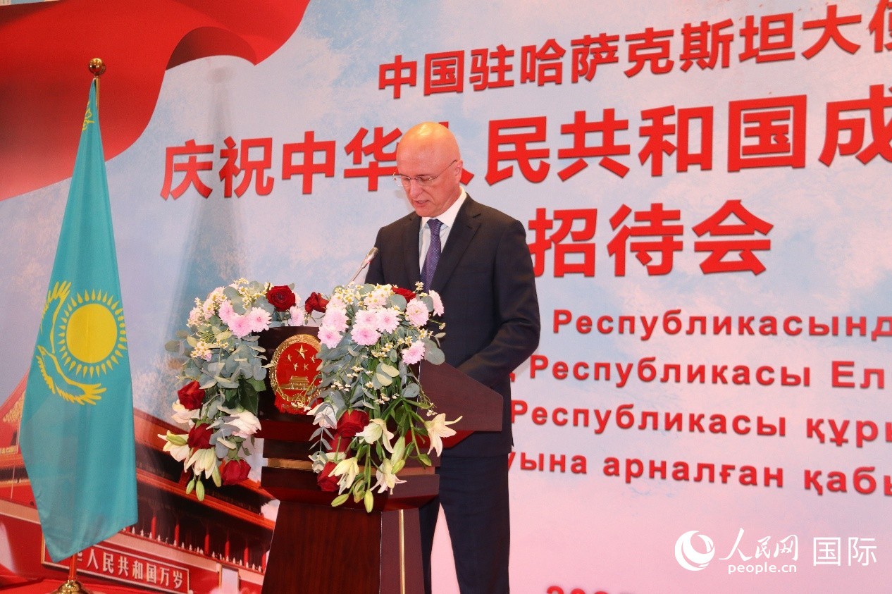 韓春霖致辭回顧新中國取得輝煌發(fā)展成就,并強(qiáng)調(diào),中國成功打贏脫貧攻堅(jiān)戰(zhàn),全面建成小康社會(huì),正意氣風(fēng)發(fā)向著全面建成社會(huì)主義現(xiàn)代化強(qiáng)國的第二個(gè)百年奮斗目標(biāo)奮進(jìn)。中國提出全球治理倡議,推動(dòng)構(gòu)建更加公正合理的全球治理體系。中哈將繼續(xù)發(fā)揮元首外交戰(zhàn)略引領(lǐng),推動(dòng)兩國關(guān)系不斷邁上新臺(tái)階。
