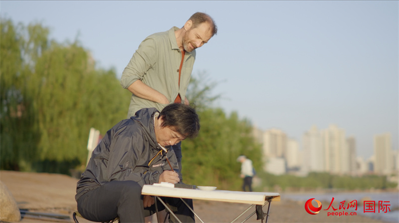 意大利藝術(shù)家馬泰奧與中國藝術(shù)家陳明坤在黃河之濱共創(chuàng)。人民網(wǎng) 嚴(yán)小晶攝