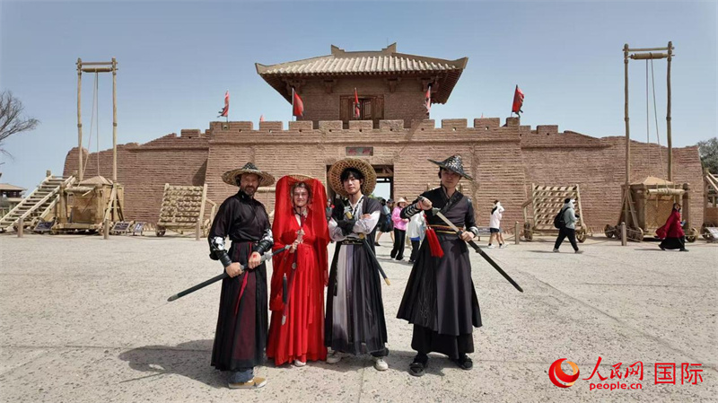 意大利藝術(shù)家馬泰奧、羅馬尼亞藝術(shù)家安德烈婭與中國藝術(shù)家吳穹等體驗中國傳統(tǒng)服飾。人民網(wǎng) 嚴(yán)小晶攝