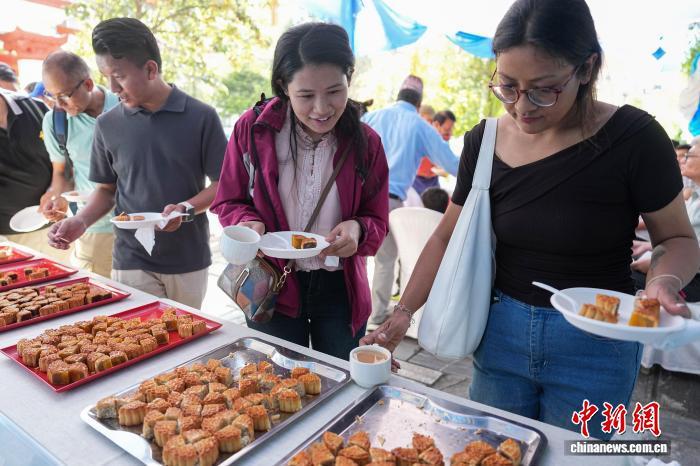 9月23日,尼泊爾中國文化中心在加德滿都舉行中秋主題活動,尼泊爾友人挑選多種口味的中式月餅。 中新社記者 崔楠 攝