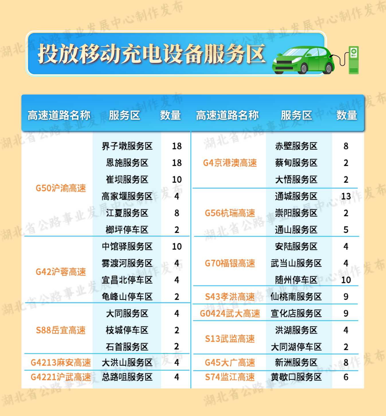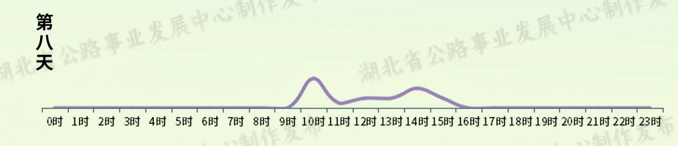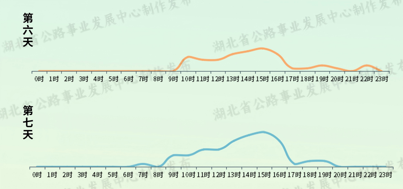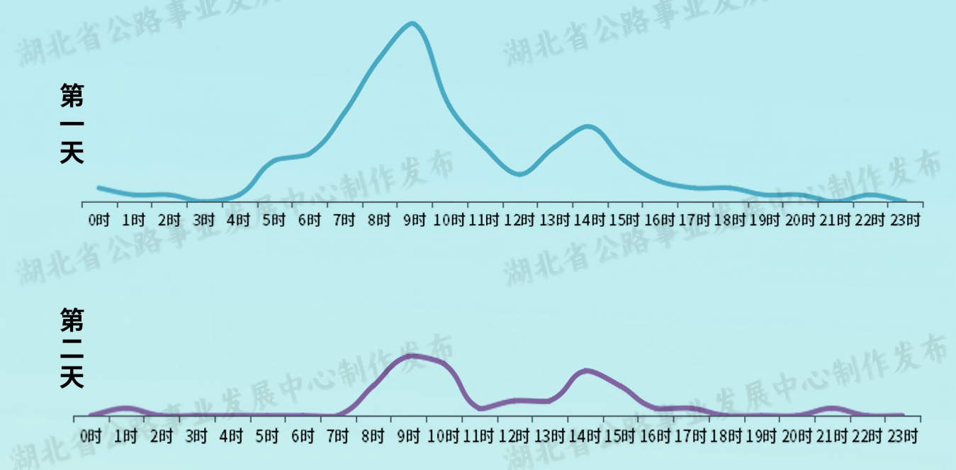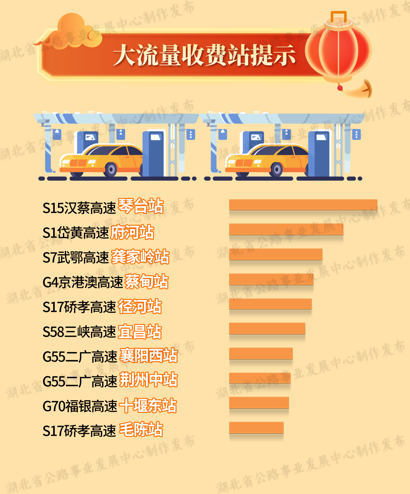 流量集中的高速公路收費(fèi)站主要有S15漢蔡高速琴臺(tái)站,S1岱黃高速府河站,S7武鄂高速龔家?guī)X站,G4京港澳高速蔡甸站,S17硚孝高速徑河站,S58三峽高速宜昌站,G55二廣高速襄陽西站、荊州中站,G70福銀高速十堰東站,S17硚孝高速毛陳站。