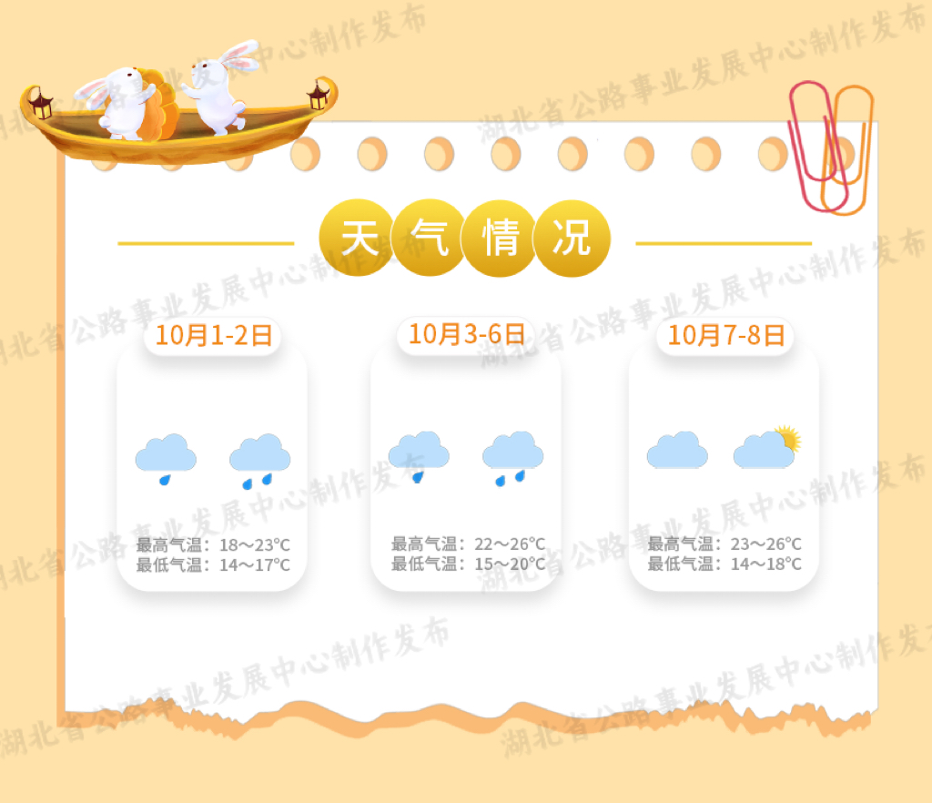 湖北省公路事業(yè)發(fā)展中心經(jīng)與省氣象服務(wù)中心會(huì)商研判,預(yù)計(jì)中秋國慶假期期間,我省多降水,氣溫有起伏。1日-2日全省有小到中雨,部分地區(qū)有大雨;3-6日全省還將有一次降水過程,省內(nèi)大部地區(qū)小到中雨;7-8日天氣轉(zhuǎn)好,大部陰天到多云,西部有小雨。具體預(yù)報(bào)如下: