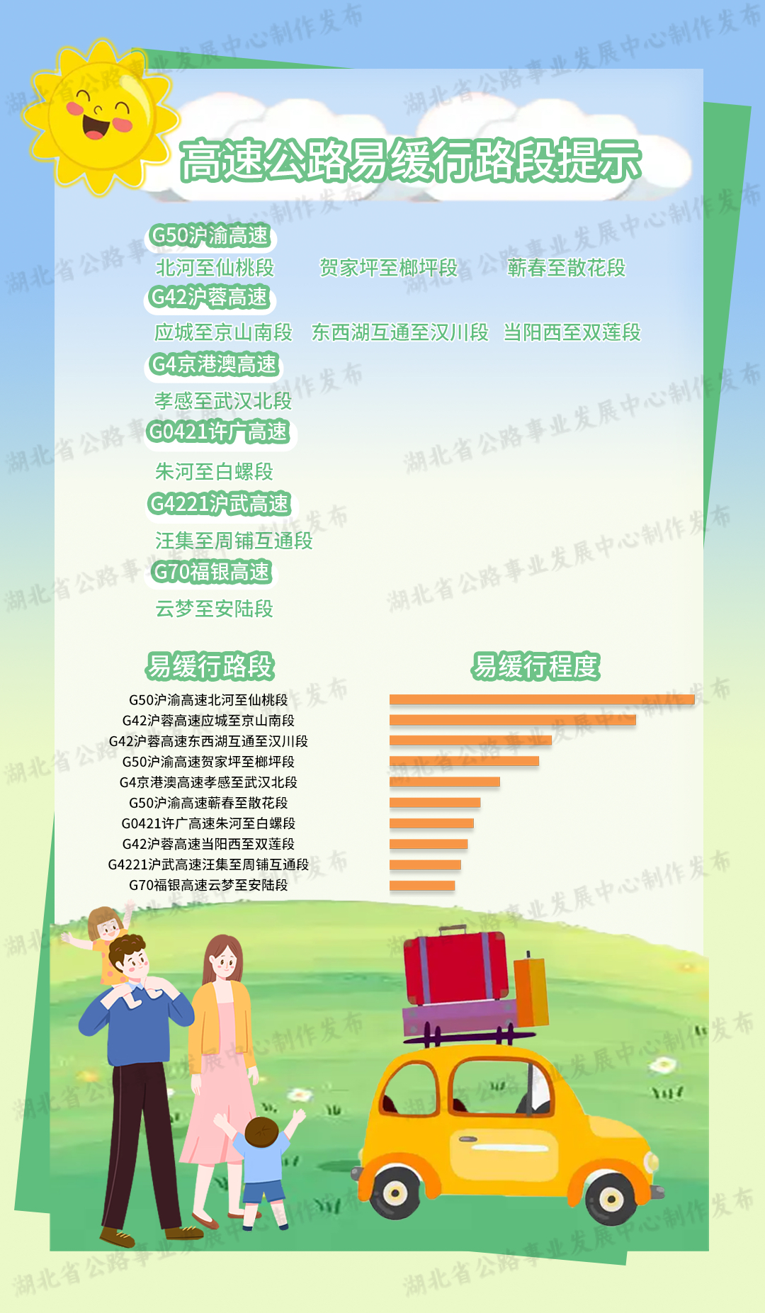 高速公路擁堵緩行主要集中在G50滬渝高速北河至仙桃段、賀家坪至榔坪段、蘄春至散花段,G42滬蓉高速應(yīng)城至京山南段、東西湖互通至漢川段、當(dāng)陽西至雙蓮段,G4京港澳高速孝感至武漢北段,G0421許廣高速朱河至白螺段,G4221滬武高速汪集至周鋪互通段,G70福銀高速云夢至安陸段。