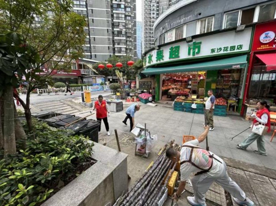 上午九點,東沙商業(yè)街區(qū)一派熱火朝天的勞動景象。行動中,各方分工明確、協(xié)同發(fā)力,形成“多元共治”的生動畫面。街道公管辦與綜合執(zhí)法中心統(tǒng)籌指揮,重點清運(yùn)街角巷尾積存雜物和大件垃圾;社區(qū)工作人員和志愿者深入綠化帶,細(xì)致?lián)焓盁燁^、紙屑,全面擦洗公告欄、垃圾箱等“城市家具”,有效解決容器漫溢、綠化帶藏污等問題。多家商戶也紛紛主動加入,拿起掃帚、水桶,清洗門前路面、擦拭櫥窗、規(guī)范物品擺放,從“各掃門前雪”轉(zhuǎn)變?yōu)椤肮沧o(hù)大家園”。