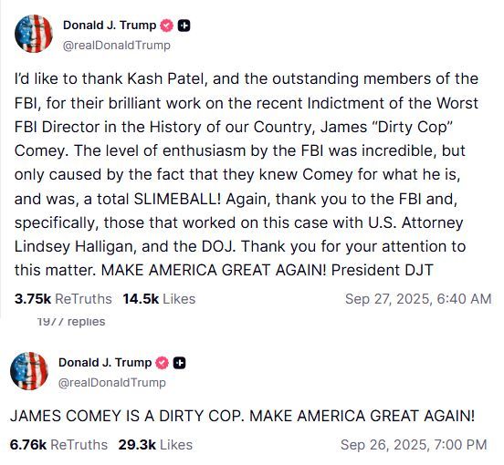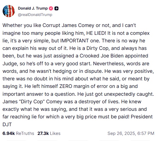 十幾個(gè)小時(shí)后,也許依然意難平,特朗普又發(fā)一篇長帖文,把科米形容為“骯臟警察”,“他曾經(jīng)是、如今還是個(gè)徹頭徹尾的卑鄙小人”。特朗普同時(shí)對(duì)現(xiàn)任聯(lián)邦調(diào)查局局長帕特爾的工作表示肯定,并對(duì)負(fù)責(zé)處理本案的相關(guān)人員表達(dá)感謝。