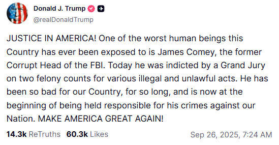 科米被起訴消息公布后,特朗普立即在社交媒體上表示“慶?!?,稱科米“長期以來對(duì)美國非常壞”,現(xiàn)在“正義終于得到伸張”。就在數(shù)天前,特朗普還在社交媒體上發(fā)帖,抱怨司法部對(duì)科米的調(diào)查遲遲沒有下文,要求盡快對(duì)科米提起訴訟。