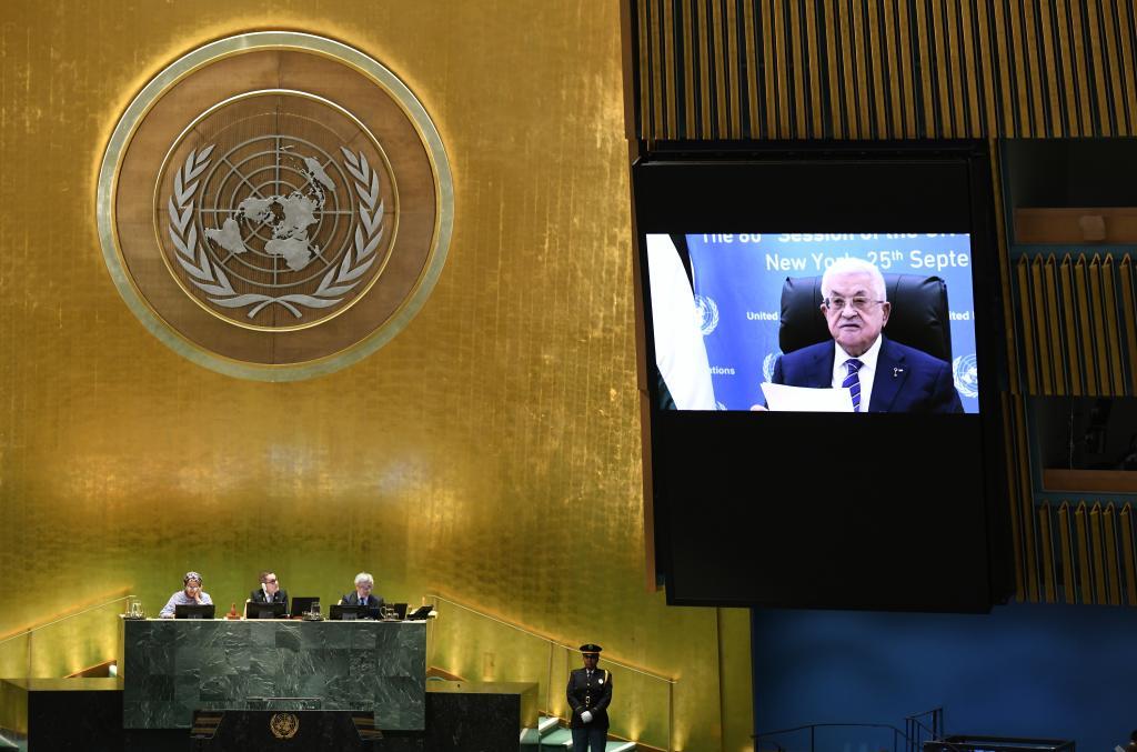9月25日,在位于紐約的聯(lián)合國總部,巴勒斯坦總統(tǒng)阿巴斯以視頻連線方式在聯(lián)合國大會一般性辯論上發(fā)言。新華社記者李睿攝