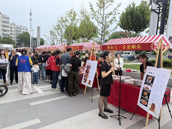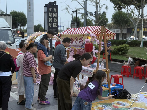 活動現(xiàn)場設(shè)置市集區(qū)與演藝區(qū)兩大板塊。市集區(qū)內(nèi)人頭攢動,轄區(qū)共建單位、音樂企業(yè)與多家商戶積極參與,匯聚特色商品與音樂互動體驗。大音琴行展出多種樂器并銷售音樂周邊產(chǎn)品,吸引眾多武漢音樂學(xué)院學(xué)生及音樂愛好者駐足交流;元祖食品推出月餅、點心等節(jié)令糕點展銷,為中秋佳節(jié)提前預(yù)熱;艷陽天·非遺鮰魚(黃鶴樓店)、中百倉儲、九州上醫(yī)館及多家大成路特色美食商戶也紛紛設(shè)點,讓市民在觀賞演出之余,盡享購物與美食樂趣。