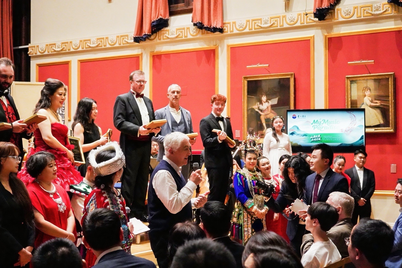 本次音樂會(huì)還特設(shè)榮譽(yù)授予環(huán)節(jié),為貴州文演集團(tuán)20名音樂家及6名歐洲音樂家頒發(fā)“中歐音樂大使”稱號(hào),以鼓勵(lì)他們履行“以音樂為橋梁、促進(jìn)人文交流”的承諾。 首次登上英國舞臺(tái)的貴州音樂家楊勝東難掩激動(dòng):“第二次搭檔我們更顯默契,中西方音樂碰撞出了新的韻味?!?/p>