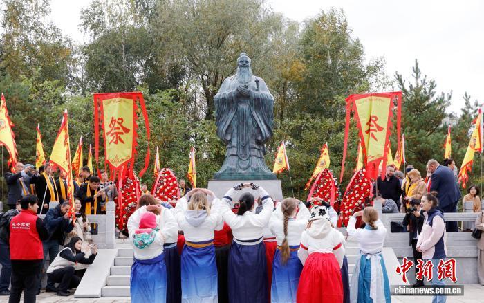 當地時間9月28日,第二屆“孔子文化節(jié)”在俄羅斯莫斯科中國貿易中心舉行。圖為俄羅斯中小學生按照中國傳統(tǒng)禮儀向孔子塑像行禮。中新網記者 田冰 攝