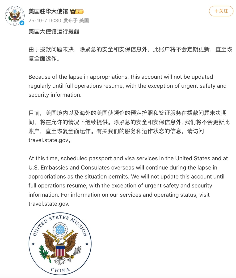 據(jù)環(huán)球時(shí)報(bào)此前報(bào)道,北京時(shí)間10月3日下午1時(shí)23分,美國(guó)駐華使領(lǐng)館在美國(guó)社交平臺(tái)X上的官方賬號(hào)上宣布,由于撥款問題未解決,除緊急的安全和安保信息外,此賬戶將不會(huì)定期更新,直至恢復(fù)全面運(yùn)作。
