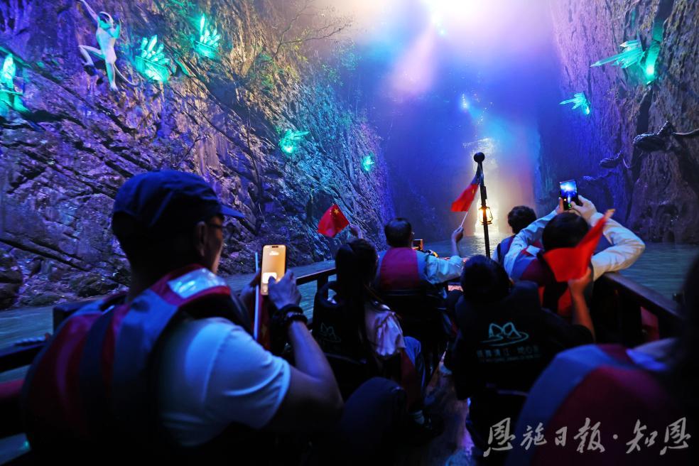 “地心奇航”作為景區(qū)全新推出的峽谷Npc王牌項(xiàng)目,成為這個(gè)假期恩施旅游當(dāng)之無愧的人氣明星,尤其受到家庭游客的青睞。游客們乘船緩緩潛入“中國紅”世界里的地心秘境,地心先知、鵲橋飛歌、踏浪迷航、時(shí)空裂縫、冰河時(shí)代、地心熔巖、巨獸之巢、地心烙印迷境中,沿途石幔如瀑、穹頂若星,情景交融,在清澈的地下河上享受“水陸并行”的獨(dú)特視角。