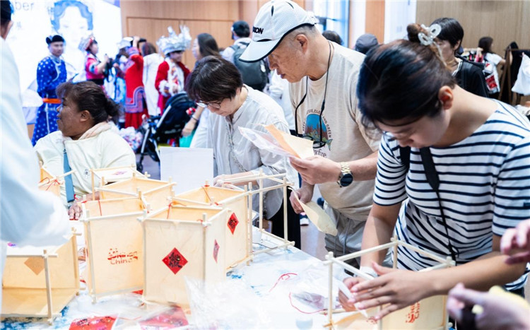 在互動(dòng)體驗(yàn)區(qū),參觀者們興致盎然地參與刺繡杯墊制作,在工藝師的指導(dǎo)下,親手繡制月亮、玉兔等圖案,體會(huì)一針一線中的匠心之美。在“月兔搗藥”香包與“中秋攬?jiān)隆睂m燈制作區(qū),嘉賓們?cè)趧?dòng)手創(chuàng)造的過程中,深入感受了中國(guó)傳統(tǒng)手工藝的趣味與智慧。民族服飾體驗(yàn)區(qū)尤為熱鬧,各國(guó)來賓紛紛換上苗族銀飾盛裝、藏族藏袍等民族服飾,拍照合影,留下難忘瞬間。