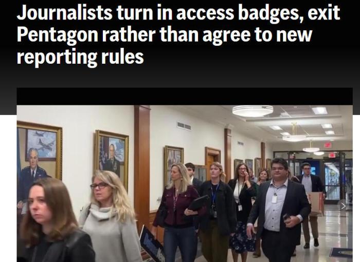 美國廣播公司(ABC)報道稱,當地時間15日下午4時,隨著美國國防部設定的最后期限臨近,五角大樓的走廊里堆滿了文件箱,大約40到50名記者交出了證件后一起離開。