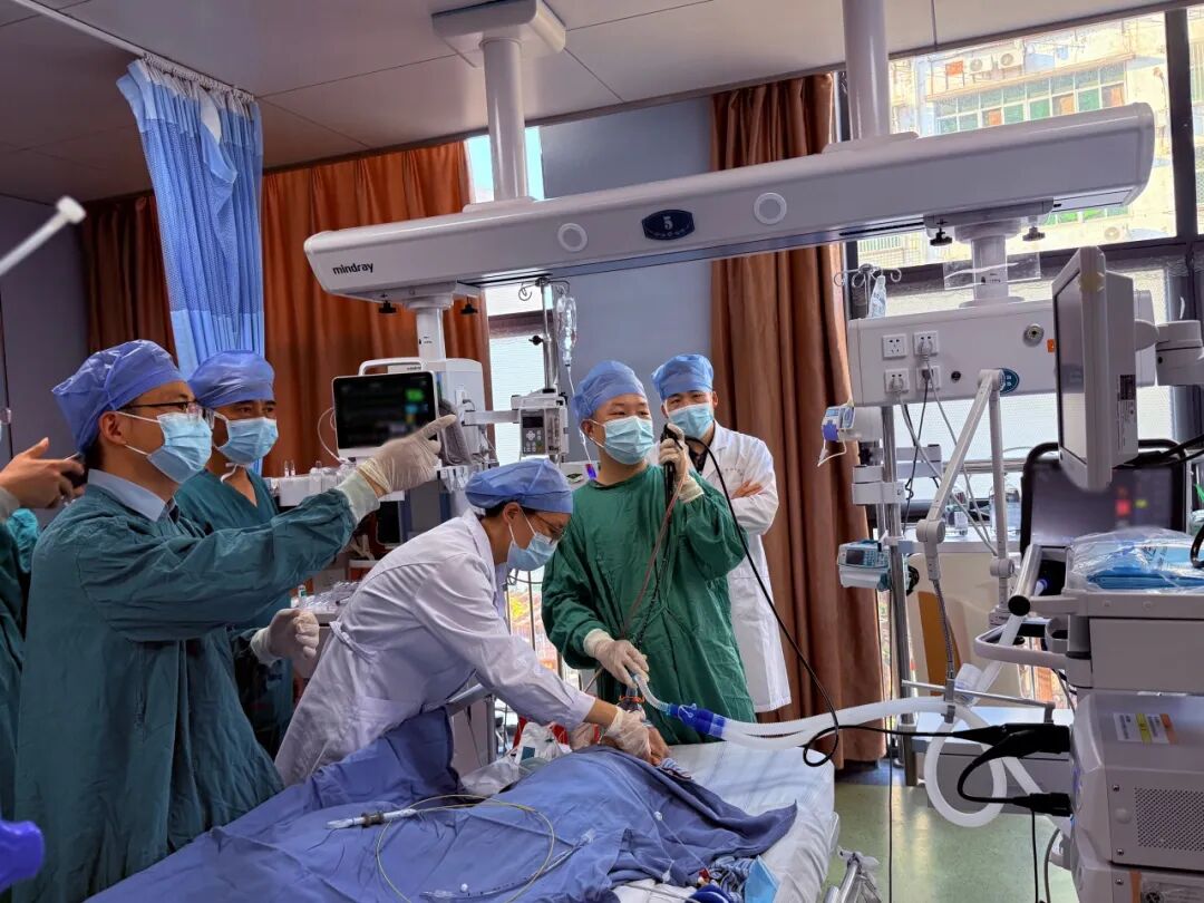 在呼吸介入團隊的統(tǒng)籌調(diào)度下,各學(xué)科團隊無縫銜接、默契配合:呼吸重癥團隊嚴密監(jiān)測患者生命體征,為手術(shù)安全保駕護航;疼痛科團隊做好全程鎮(zhèn)痛管理,減輕患者不適;邱琦、魏光醫(yī)生則專注于精細操作——先將球囊精準送入狹窄氣道并充氣擴張,為支架置入開辟空間,隨后,將半覆膜金屬支架穩(wěn)穩(wěn)送入氣道狹窄處。