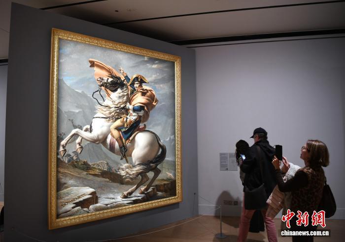 圖為觀眾在欣賞大衛(wèi)創(chuàng)作的名畫《拿破侖翻越阿爾卑斯山》?!≈行律缬浾?李洋 攝