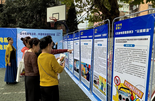 在社區(qū)幸福廣場,一排排科普展板前圍滿居民。展板從無線電基本原理講起,通過“以案釋法”的形式揭露“黑廣播”“偽基站”的詐騙手法,詳細說明危害與識別技巧,引導居民合法使用頻譜資源。