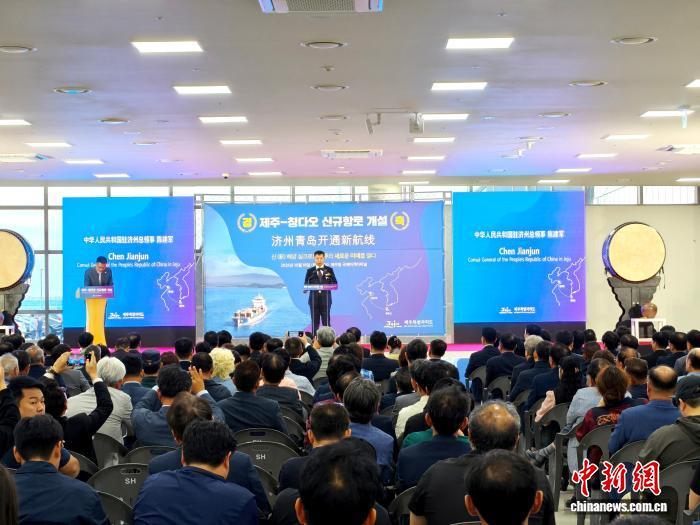 10月18日,“濟(jì)州—青島新航線(xiàn)開(kāi)通”慶?;顒?dòng)在韓國(guó)濟(jì)州舉行。圖為雙方代表參加船舶入港儀式。中國(guó)駐濟(jì)州總領(lǐng)事館 供圖